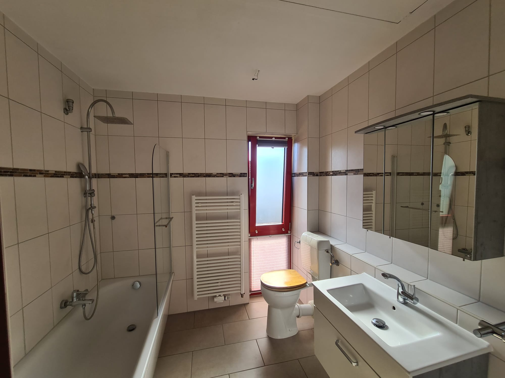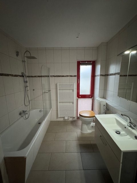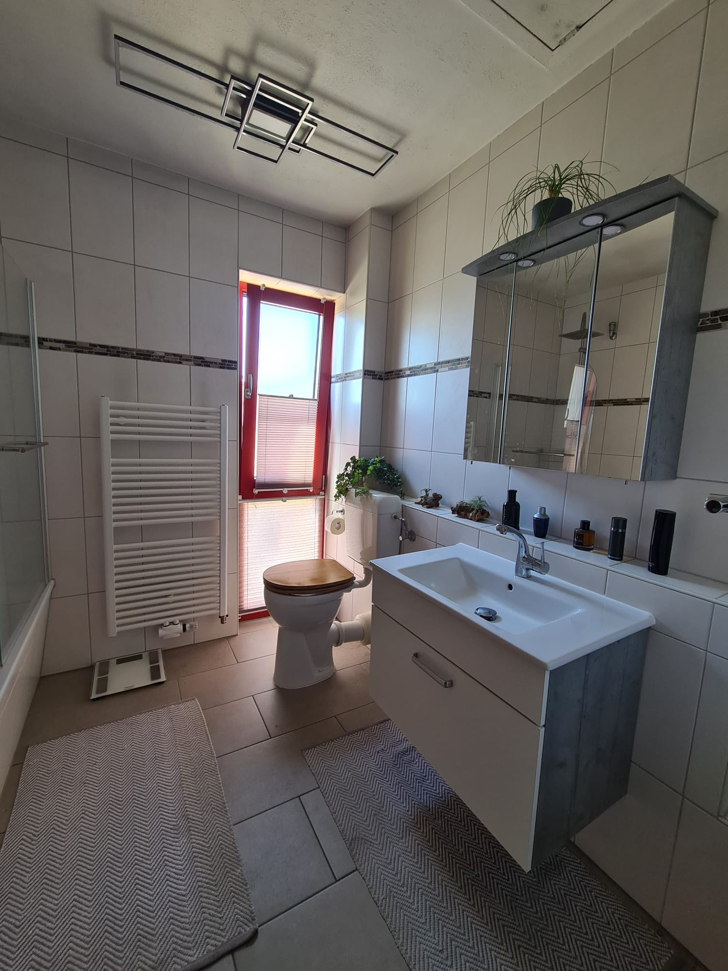 Badewanne mit Abtrennung, Waschbecken mit Unterschrank, Toilette, Spiegelschrank