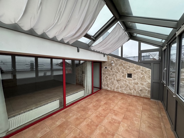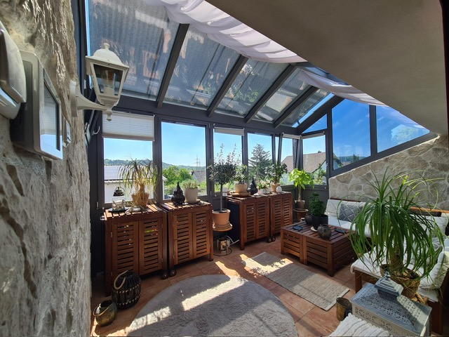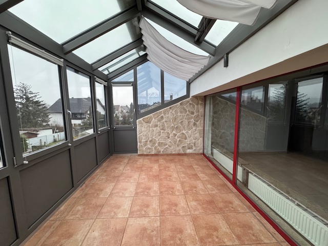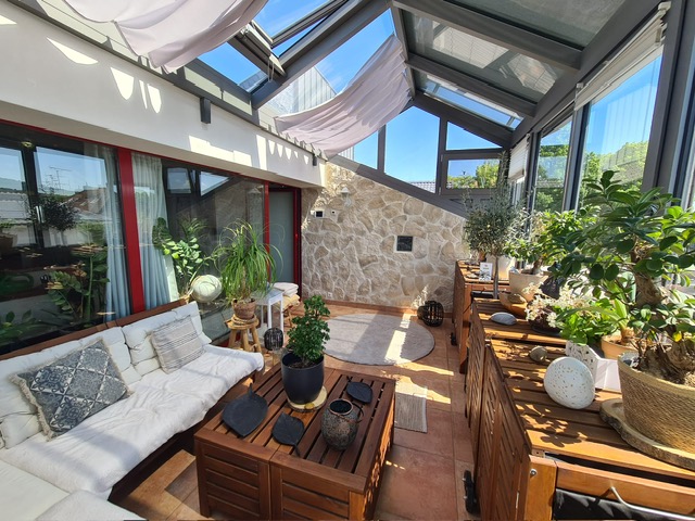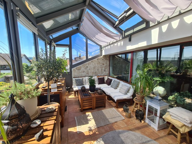Ein besonderes Highlight der Wohnung ist der im Jahr 2011 errichtete Wintergarten, der den Wohnbereich auf sehr angenehme Weise erweitert. Der Wintergarten verfügt über eine elektrische Fußbodenheizung, elektrisch zu öffnende Dachfenster sowie eine elektrische Beschattung. Darüber hinaus ist er mit moderner Sensor- und Steuertechnik ausgestattet, darunter Wind-, Regen-, Temperatur- und Luftfeuchtigkeitssensoren. Markise, Rollladen und Dachfenster lassen sich komfortabel über digitale Wandpaneele steuern und programmieren – beispielsweise für automatisches Öffnen oder Schließen bei bestimmten Wetterbedingungen oder zu festgelegten Zeiten. Große Panoramafenster sorgen bereits vom Wohnbereich aus für einen schönen Blick in den Wintergarten und schaffen eine helle und angenehme Wohnatmosphäre.