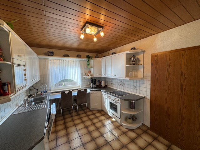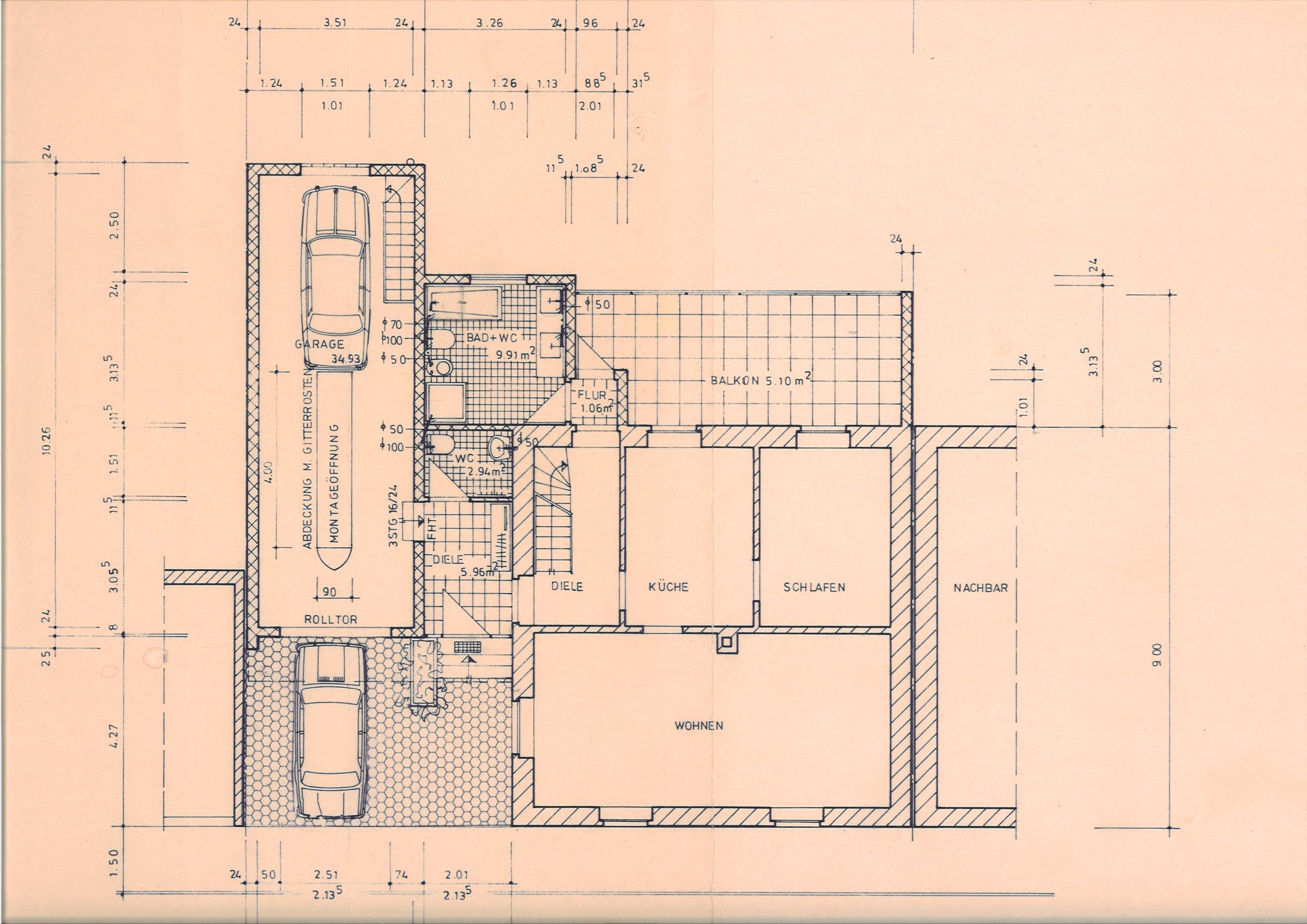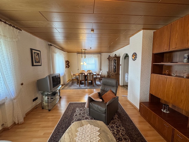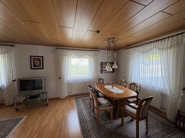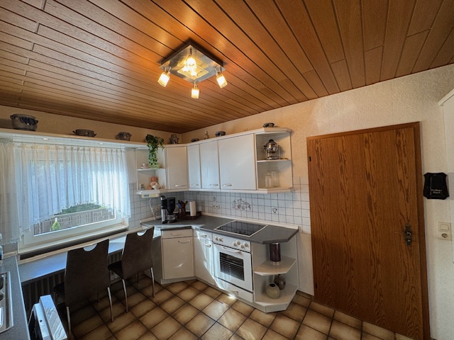 Im Erdgeschoss erwartet Sie ein großzügiges Wohn- und Esszimmer, das durch seine Offenheit und Helligkeit besticht. Die angrenzende Küche ist mit einer Einbauküche aus den 1990er Jahren ausgestattet und bietet ausreichend Platz für gemeinsame Kochabende. Ein geräumiges Badezimmer, Diele, Flur, Schlafzimmer sowie ein Balkon mit Blick in den Garten und die umliegende Natur runden das Erdgeschoss ab. Von hier aus gelangen Sie außerdem direkt in die ebenfalls großzügig geschnittene, mit einer Werkstattgrube ausgestattete Garage – besonders praktisch im Alltag.