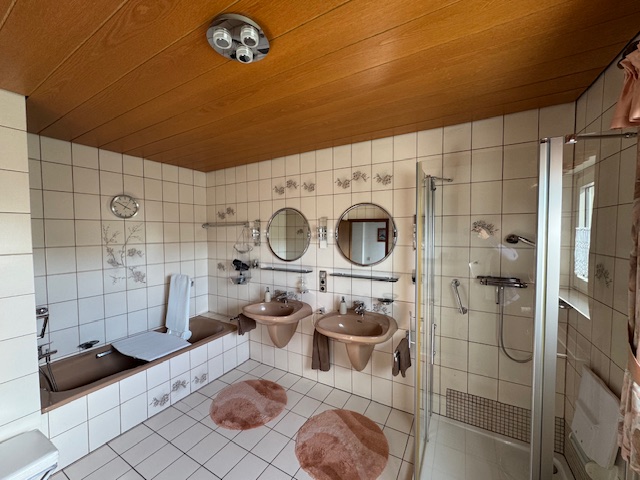 Badewanne, Dusche mit Kabine (2015) 2 Einzelwaschbecken, Toilette, Bidet