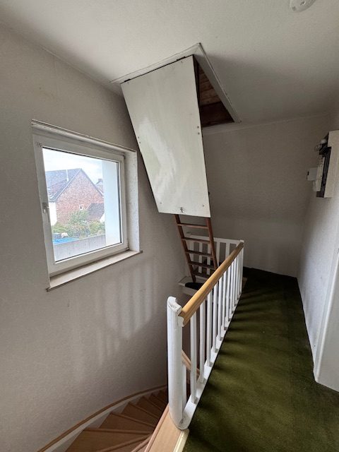Das Hochparterre bildet das Herzstück des Hauses. Hier stehen Ihnen im Wesentlichen ein großzügiges Wohnzimmer, ein angrenzendes Esszimmer, eine Küche mit älterer Einbauküche sowie ein Tageslichtbad zur Verfügung. Der Grundriss vermittelt ein angenehmes Raumgefühl und bietet ideale Voraussetzungen für individuelle Gestaltungsmöglichkeiten. Eine Holztreppe mit originalem Handlauf aus der Erbauerzeit führt Sie ins Dachgeschoss, wo bis zu vier Schlafzimmer realisiert werden können. Alternativ lässt sich der Bereich ideal in ein Elternschlafzimmer mit Ankleide und zwei Kinderzimmer aufteilen. Über den Flur des Dachgeschosses erreichen Sie per Ausziehleiter den Dachboden – ein zusätzlicher Stauraum mit Ausbaupotenzial.